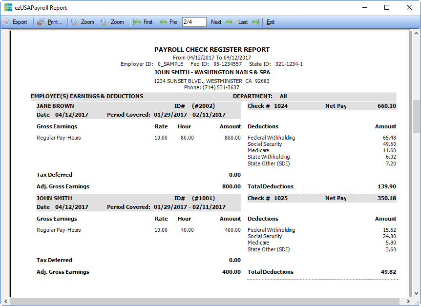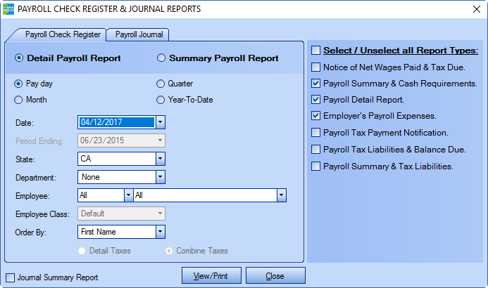 Enter or select Starting Date / Ending Date / State / Department / Employee to print Payroll Register. Select Order By to print order by Date / Check No / Employee ID / First Name / Last Name. Place a mark if you want to print detail or summary.